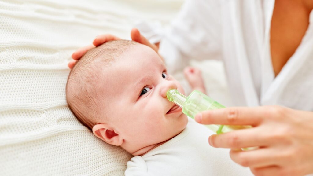 Ulgę w tych uciążliwych objawach przeziębienia u niemowlaka mogą przynieść krople do nosa z solą 0,9 procent. Od trzeciego miesiąca życia można stosować krople z oksymetazoliną. To substancja, która redukuje obrzęk, więc sprawdzi się na zatkany nos u niemowlaka. Jeśli natomiast mamy do czynienia z gęstą wydzieliną, dla rozrzedzenia kataru warto sięgnąć po wodę morską.